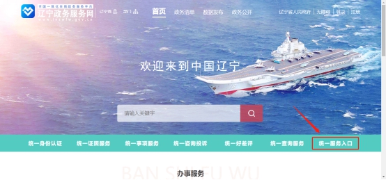 1、 政务网登陆入口://www.lnzwfw.gov.cn/,登录政务网小黄书,选择“统一服务入口”。