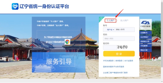 等待跳转辽宁省统一身份认证平台,选择“个人用户”,输入账号、密码、验证码进行登录。