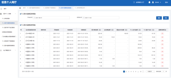 点击左侧菜单 <个人医疗消费信息查询> ,进入查询界面,通过输入界面的开始时间,结束时间,点击查询按钮,即可查询个人的相关消费信息; 个人医疗消费信息查询>