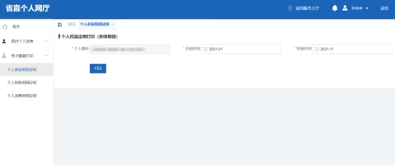 首先选择左侧电子票据打印栏,点击 <个人参保明细证明> ,进入功能页面,选择要打印的开始时间,结束时间,点击打印按钮即可打印出参保明细证明单,并且单上加盖了辽宁省直医保的电子签章; 个人参保明细证明>