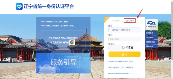 等待跳转辽宁省统一身份认证平台,选择“法人用户”,输入账号、密码、验证码进行登录。