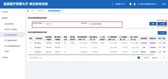 以单位缴费明细查询为例,选择左侧菜单中的单位缴费明细查询功能,进入功能页面,通过选择界面的应费款所属期和险种类型,即可查询该单位缴费明细相关内容;