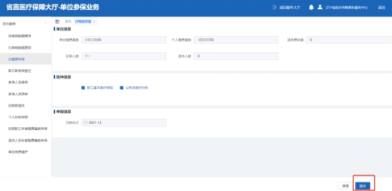 以月缴费申报为例,点击左侧菜单经办服务下的月缴费申报功能,进入申报界面,单位需要核对界面中的单位缴费基数,个人缴费基数以及人数,无误后点击右下方的提交,即完成月缴费申报提交;
