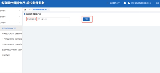 以医疗缴费通知单为例,单位申报完毕月缴费,即可在打印服务中的医疗缴费通知单打印来打印缴费通知单,进入医疗缴费通知单打印界面,选择界面的费款所属期号,来进行打印